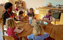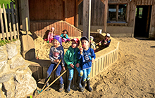Die Kinder, die zur Kur kommen, können als gesunde Begleitkinder mit Mutter oder Vater dabei sein oder selbst Therapien erhalten, wenn sie kurbedürftig sind. Grundsätzlich ist es uns ein Anliegen, dass alle Kinder – ob kurbedürftig oder nicht – einen heilsamen Kurprozess erfahren. So werden die Kinder alters- und entwicklungsgemäß entsprechend der Waldorfpädagogik in 3-4 Gruppen betreut: die unter 3 jährigen Kinder werden vormittags in der Wurzelstube betreut, die 3-6 jährigen Kinder vor- und nachmittags in der Spielstube, ab Schulalter bis 12 Jahre werden die Kinder in der Grüntengruppe betreut. Wenn mehrere Kinder zwischen Kindergarten und Einschulung stehen oder in einer Vorschulklasse sind, gibt es noch zusätzlich die Brückengruppe.